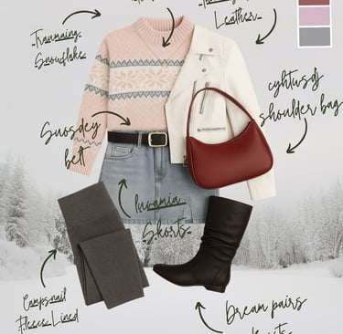 Stay warm and stylish this winter with this soft, feminine cold-weather outfit. A pink snowflake sweater paired with a cream faux-leather jacket, denim mini, and fleece-lined leggings keeps things cozy while still giving off that Pinterest-ready aesthetic. Finish the look with classic black boots, a 14K gold pendant necklace, and a deep red shoulder bag for the perfect balance of casual and chic. Whether you’re heading to brunch, Christmas shopping, or a snowy date night — this winter outfit is comfy, layered, and effortlessly pretty. Disclaimer: As an Amazon associate, i earned from qualifying purchases