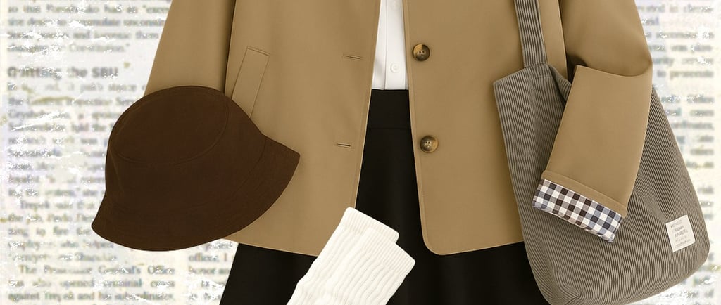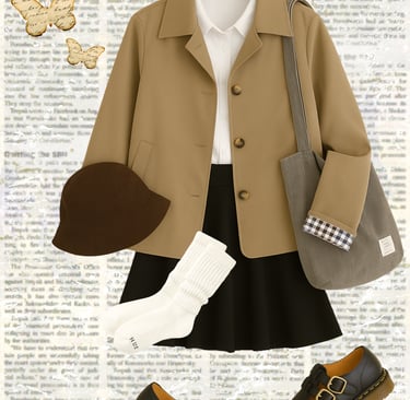 This Japanese-inspired winter outfit gives cozy café-core vibes with timeless simplicity. ☕✨ A classic beige coat and crisp white blouse pair effortlessly with a black skirt, soft slouchy socks, and chunky Mary Janes. Add a brown bucket hat and gray tote for that effortlessly chic, Tokyo-street-style look — comfy, cute, and perfectly understated. 🍂🖤
