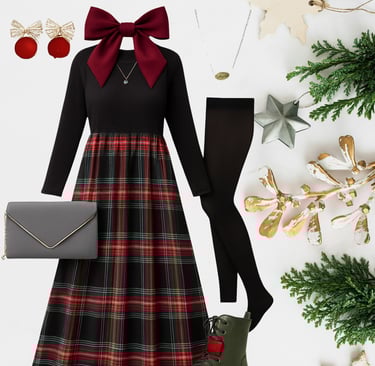 A cozy-cute Christmas look built around a classic plaid maxi dress, a statement burgundy bow, and olive lace-up boots. Finished with festive bow earrings, a soft folded tight, and a sleek gray clutch. Perfect mix of merry, comfy, and classy.
