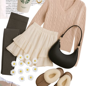 ✨ It’s a look that says soft mornings, cozy layers, and quiet confidence — perfect for coffee runs, lounging in style, or capturing that Pinterest-worthy winter moment. This photo collage captures the essence of a soft, cozy winter aesthetic — blending comfort, warmth, and effortless feminine style. A blush pink cable-knit sweater pairs beautifully with a flowy cream ruffle mini skirt, layered over charcoal fleece-lined leggings for the perfect mix of girly and practical. The look is accessorized with chunky gold hoop earrings and a sleek black crescent shoulder bag, adding a touch of polish to the laid-back vibe. Taupe fur-lined slippers bring a sense of at-home coziness, while the reusable Starbucks cup ties it all together with that classic “coffee-and-errands” feel.